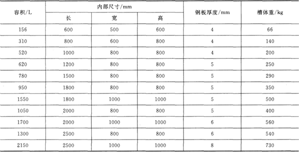 計算出槽體內部尺寸后,再按表8-3規格化。如需要槽襯,則尺寸應適當加大