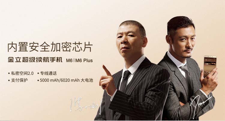 這款在7月26日發(fā)布的內置安全加密芯片手機由馮小剛和余文樂進行品牌代言。由馮小剛余文樂聯(lián)合打造的《手機芯戰(zhàn)》預告片中,隱約出現(xiàn)的機器就是金立M6和M6 Plus,整個預告片貫穿著信息時代“安全”的重要性。