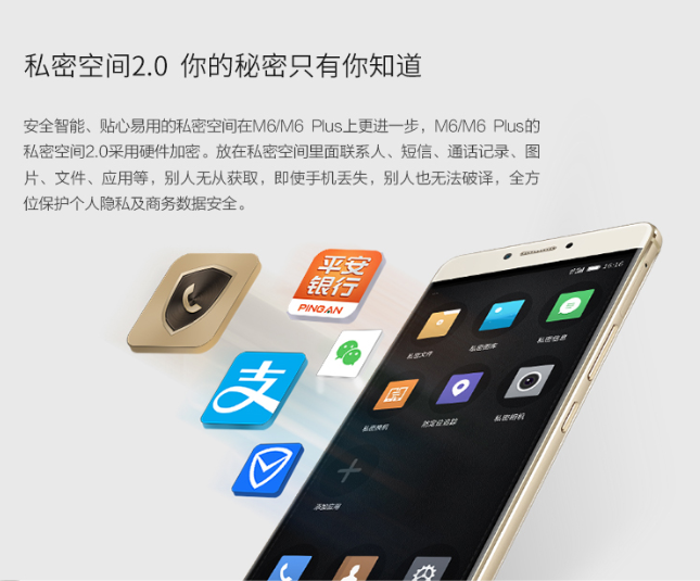 M6/M6 PLUS的私密空間2.0采用硬件加密算法,放在私密空間里的信息就算手機丟失別人也無法破譯,全方位保護個人隱私及商務數(shù)據(jù)安全。