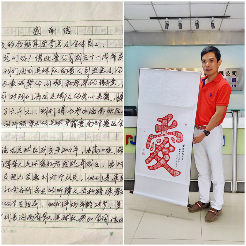 合航集團(tuán)愛心基金會自成立以來,一直秉持著關(guān)愛員工回饋社會的理念,為幫助這群可愛的孩子筑夢,合航集團(tuán)于2015年十周年慶典上向海南省海龍足球隊捐贈人民幣五萬元整,并于2016年開始正式撥款資助球隊比賽。海龍足球隊為感謝合航集團(tuán)的關(guān)愛,特意為我司李董寄來了親筆感謝信及紀(jì)念品,讓愛散播在每個角落是我們共同努力的目標(biāo)。